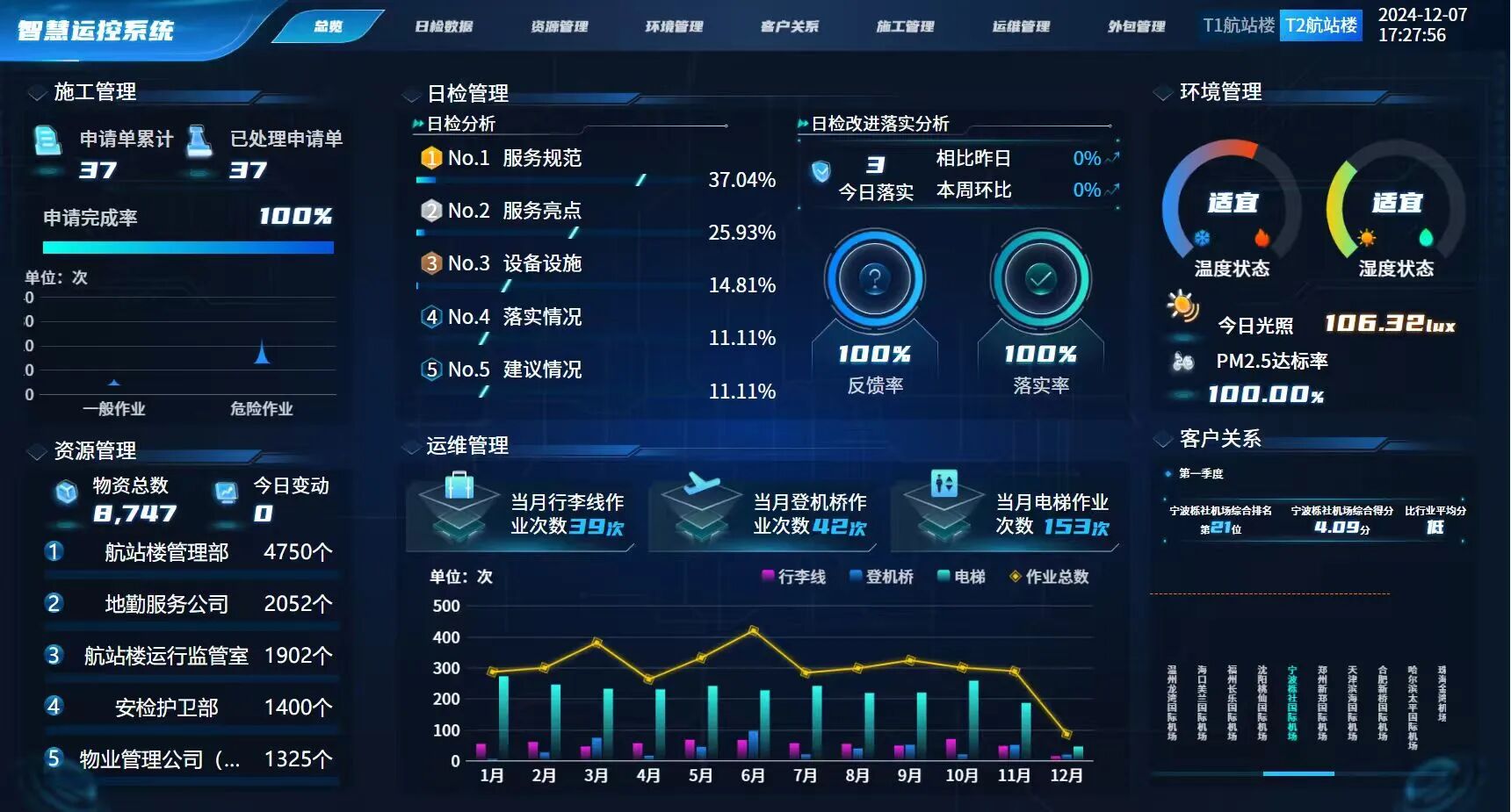 寧波機(jī)場航站區(qū)智慧協(xié)同決策運(yùn)控平臺以航站區(qū)智慧運(yùn)控系統(tǒng)為功能底座和數(shù)據(jù)框架,部署航站區(qū)日檢查數(shù)據(jù)、 資源管理、環(huán)境管理、客戶關(guān)系、施工管理、運(yùn)維管理、外包管理七大二級模塊,構(gòu)建全景式多矩陣一體化航站區(qū)協(xié)同決策運(yùn)控平臺(巡航數(shù)字梳理),工作人員通過集成大屏隨時(shí)查看航站區(qū)總體運(yùn)行情況和各二級模塊數(shù)據(jù)研判施策,漸進(jìn)式建立運(yùn)行“四網(wǎng)一統(tǒng)”全鏈四云平臺。